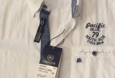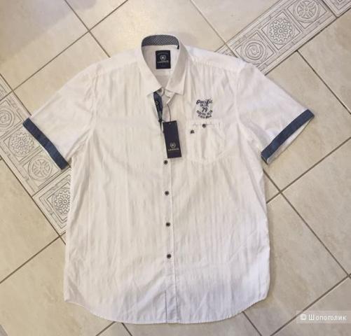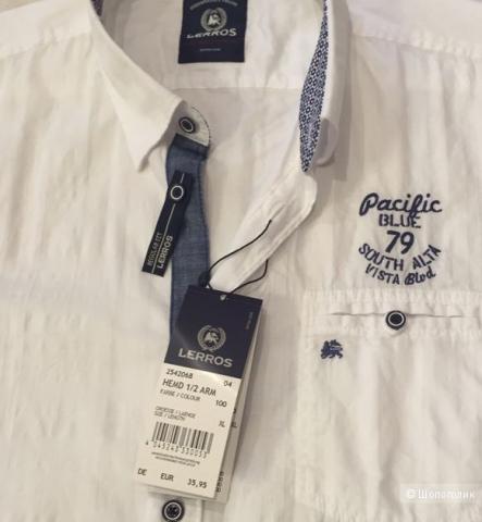Новая мужская рубашка с короткими рукавами LERROS р. XL. Состав: 100% хлопок. Цвет белый со слабо заметной структурной полоской. Нагрудный кармашек с вышитым логотипом и с петелкой — застежкой на пуговицу. На груди- вышивка.